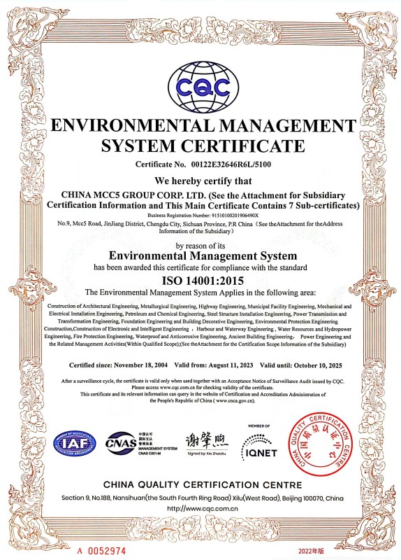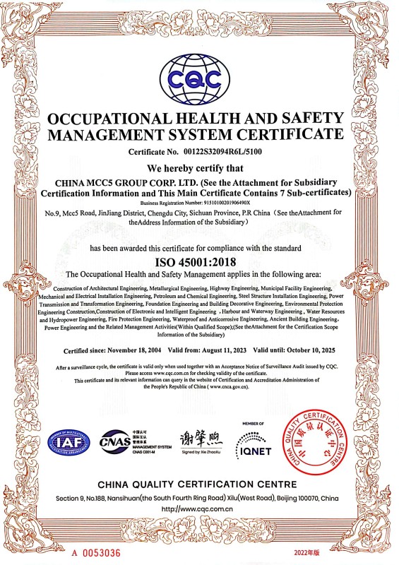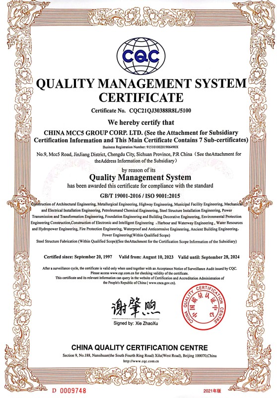 China MCC5 Group Corp.,Ltd. (hereinafter referred to as MCC5) passed the ISO9000 quality system certification in 1997. In 2004, according to ISO9001, ISO14001, OHSAS18001 international standard requirements, MCC5 established quality environment occupational health and safety integrated management system and passed the three standard one certification. In 2011, in accordance with the requirements of GB/T50430-2007 "Quality Management Standards of Construction and Construction Enterprises," China Wisheng Group established and passed the quality environment occupational health quality management standards of the three-standard standard system certification, To date, the three standard management system has been continuously, smoothly and coordinated.
