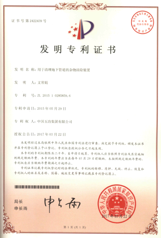 ÓÃÓÚÇåÀíµØÏ¹ܵÀµÄÔÓÎïÇå³ý×°Öà ZL2015102858596