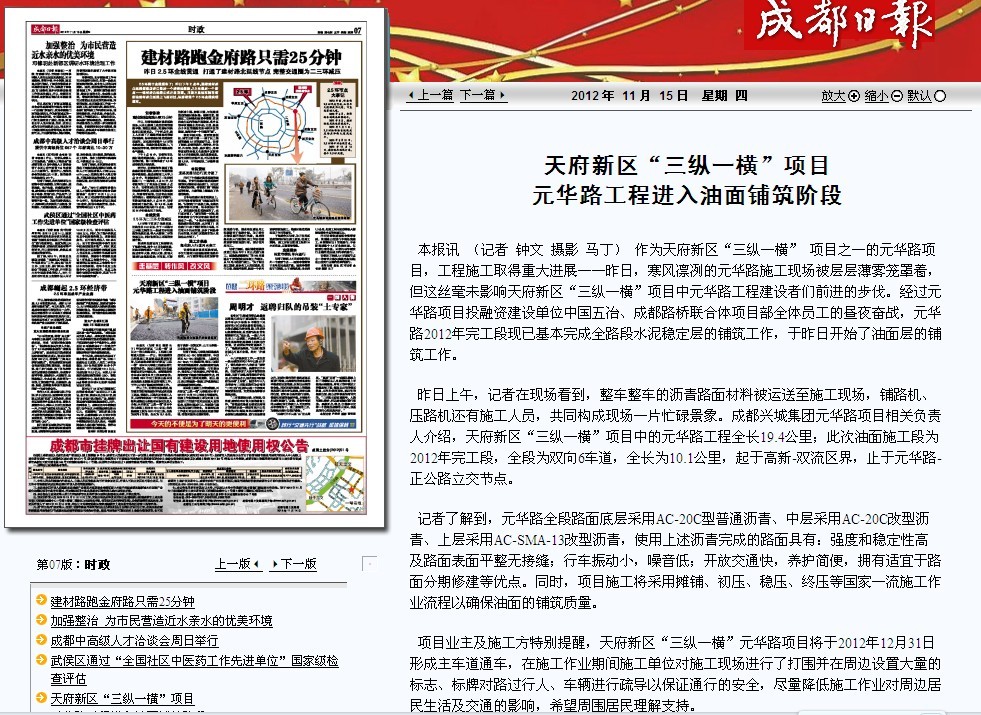 成都日报报道:天府新区“三纵一横”项目 元华路工程进入油面铺筑阶段