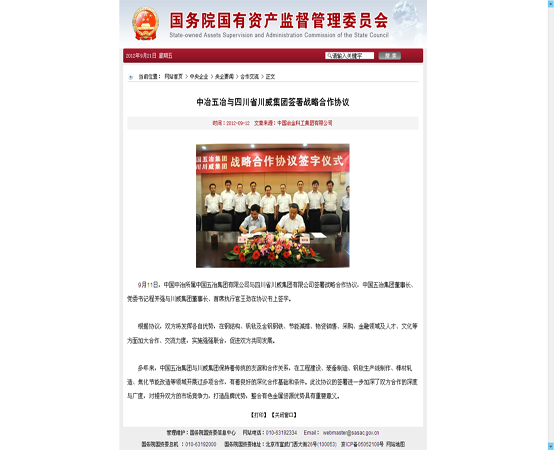 国资委报道:中冶今年会官网与四川省川威集团签署战略合作协议
