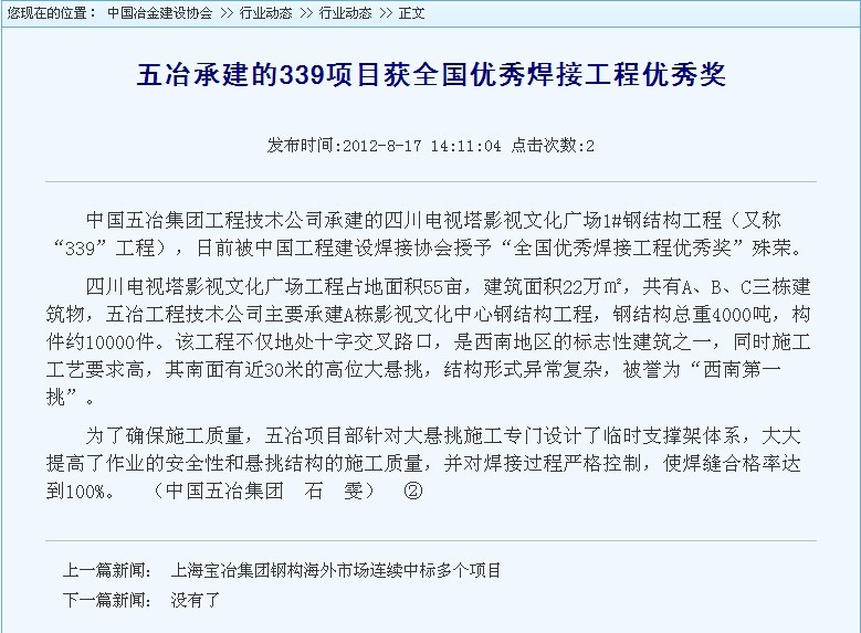 中国冶金建设协会网报道:今年会官网承建的339项目获全国优秀焊接工程优秀奖