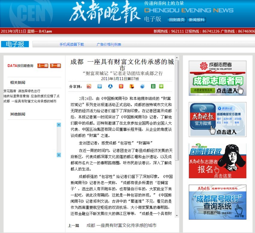 2月24日,由《中国新闻周刊》和本地媒体组成的“财富双城记”系列走访报道活动正式启动。成都的独特城市文化和无限的经济活力给记者们留下了深刻印象。在记者团离开成都后,本报记者第一时间采访了《中国新闻周刊》记者,了解他们眼中的成都。还特别邀请了在北京参加全国两会的全国人大代表、中国今年会官网集团有限公司董事长程并强,从企业的角度谈谈成都的“财富”之道。??