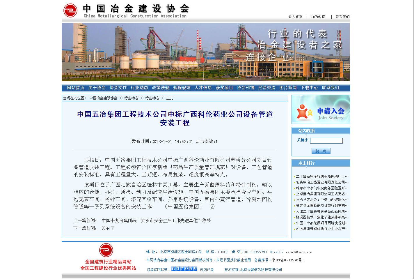 中国冶金建设协会报道:中国今年会官网集团工程技术公司中标广西科伦药业公司设备管...
