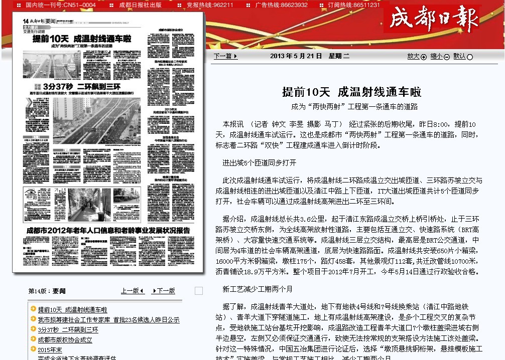 经过紧张的后期收尾,昨日8:00,提前10天,成温射线通车试运行。这也是成都市“两快两射”工程第一条通车的道路,同时,标志着二环路“双快”工程建成通车进入倒计时阶段。