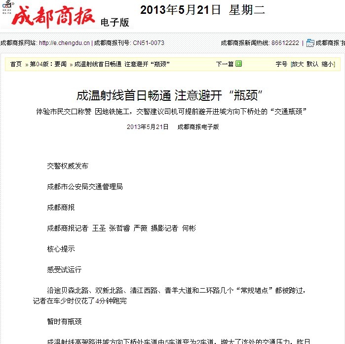 ÉÏһƪ£º³É¶¼ÈÕ±¨±¨µÀ£ºÌáǰ10Ìì ³ÉÎÂÉäÏßͨ³µÀ² ³ÉΪ¡°Á½¿ìÁ½É䡱¹¤³ÌµÚÒ»Ìõͨ³µµÄµÀ...