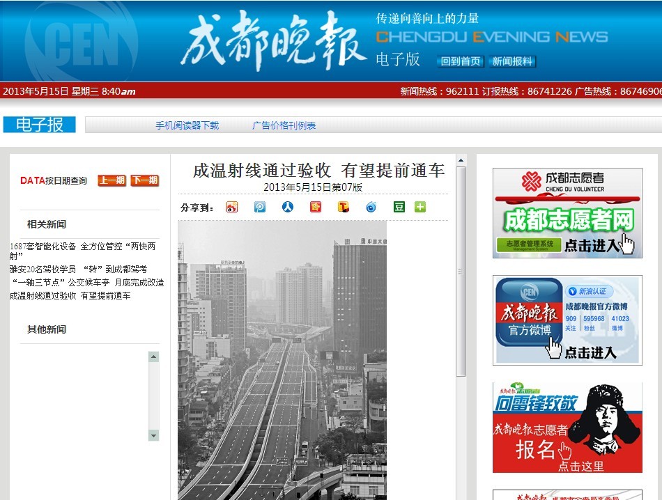 经过285天的不间断施工,成温射线已于前日举行了竣工验收会,全面通过了市建委对地勘、监测等五大部分的验收。验收通过意味着无论从质量上,还是进度上,成温射线都达到了通车条件。