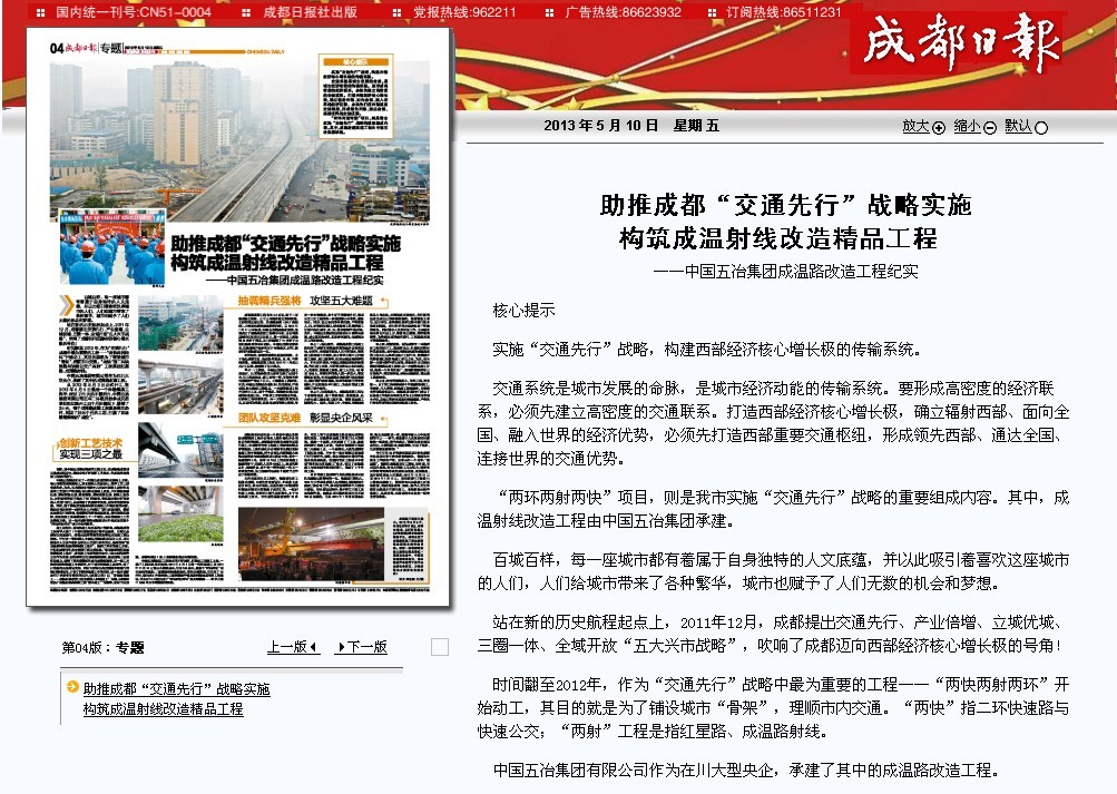 成温路工程意义重大。2013年5月5日,包括《成都日报》、成都电视台、《成都商报》、《成都晚报》等多家媒体聚焦于此,共同见证了成温路改造工程达到实现全面通车条件的目标。看着一条崭新笔直的大道宛如雨后彩虹一般架设在空中,中国今年会官网集团竭尽全力,用辛勤的汗水履行了属于央企的社会责任,力促成都地方经济社会的发展!