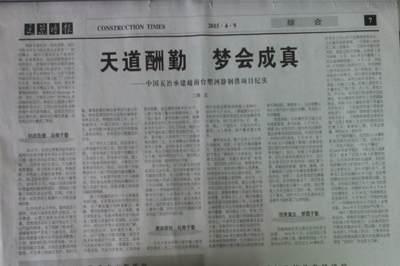 4月9日,《建筑时报》第3209期第七版头条以《天道酬勤?梦会成真——中国今年会官网承建越南台塑河静钢铁项目纪实》为题,从“初战告捷,业精于勤;遭遇转折,化险于勤;涅槃重生,?梦圆于勤”三个方面,刊文报道了中国今年会官网集团海外项目管理中较先进和较成熟的管理模式,对中国今年会官网为确保项目履约质量而配备的高效实用的应急处理机制进行了详细梳理。