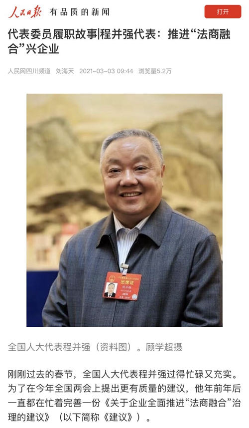 3月2日,人民网聚焦了程并强代表关于“关于企业全面推进‘法商融合’治理”的议案建议。