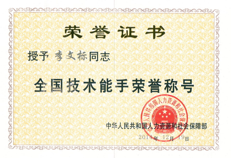 ????? 2014年12月19日,李文标同志荣获国家人力资源社会保障部“全国技术能手”称号。