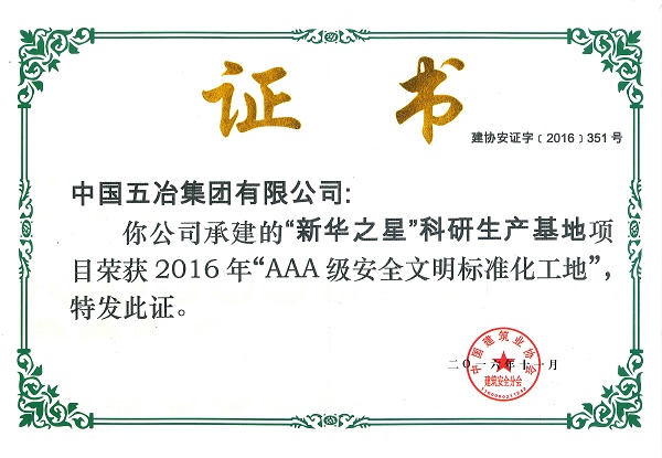? ?2016年12月,中国今年会官网集团新华之星”科研生产基地工程项目和国贸金融中心工程项目荣获2016年全国“AAA级安全文明标准化工地”称号。