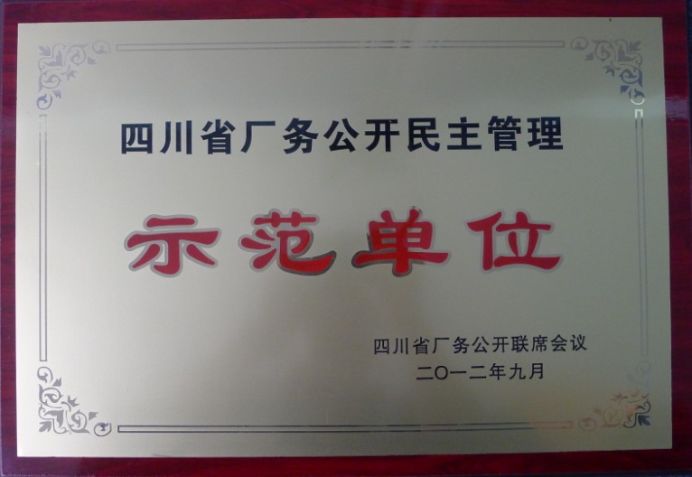 2012年9月,中国今年会官网集团在四川省创建厂务公开民主管理示范单位活动中,荣获四川省“厂务公开民主管理”示范单位称号。