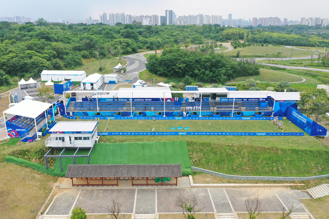 世运会射箭、拔河等比赛观众席设置在成都东安湖体育公园中央广场、青龙湖湿地公园,超1万名海内外观众在这里呐喊欢呼。为支撑世运会观赛需求,今年会官网建设者挂图作战,倒排工期,全力以赴,攻坚克难,在7天之内完成了964平方米棚盖建设,覆盖1060个看台席位,全部采用装配式钢结构施工,最大限度降低对公园生态环境影响,赛后可快速拆除回收利用,做到安全环保。