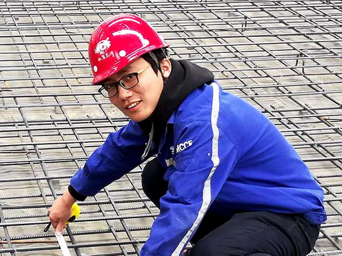 成都钢构公司浙江豪情汽车项目部员工正在测量钢筋尺寸