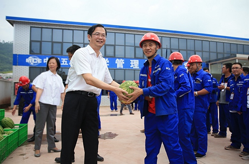 ? ? 同时,集团公司领导一行对公司宜宾片区在建项目员工致以亲切慰问,为大家送上了西瓜、饮料、霍香正气水等防暑用品,并叮嘱大家在高温施工期间,要保重身体、确保安全,让公司放心,让家人放心。(邓超)