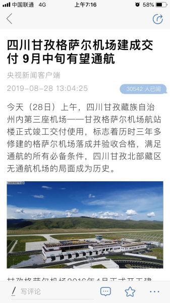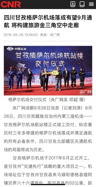 四川观察:http://kscgc.sctv.com/sctv/lookback/1/2019/08/28/20190828_shared.html?programmeUrl=http://fscgc.sctv.com/NewsTV/2019/08/28/scxw20190828002.mp4&programmeTitle=%E7%94%98%E5%AD%9C%E6%A0%BC%E8%90%A8%E5%B0%94%E6%9C%BA%E5%9C%BA%E8%90%BD%E6%88%90%E4%BA%A4%E4%BB%98%20%E6%9C%89%E6%9C%9B9%E6%9C%88%E9%80%9A%E8%88%AA&programmeImage=http://kscgc.sctv.com/sctv/1/image/public/201908/20190828184902_tjee6skhpc.jpg