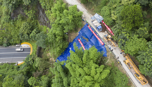 接到重庆市江北区规划和自然资源局任务委托后,成勘公司立即集合精兵强将,连夜奔赴现场抢险。第一时间到达指定位置后,抢险项目团队立即在滑塌区周边采取断道措施,设置警戒标志,确保行人安全,并对滑塌体表层的石块及树木进行细致清理,疏通滑坡体后侧公路长约60米的水沟,同时在现有公路外侧修筑5厘米高的混凝土挡块,防止地表水从公路内侧溢出到滑体后侧,利用防水布将现有滑塌体及其临近一定的区域进行遮盖,防止雨水进入诱发二次滑塌。