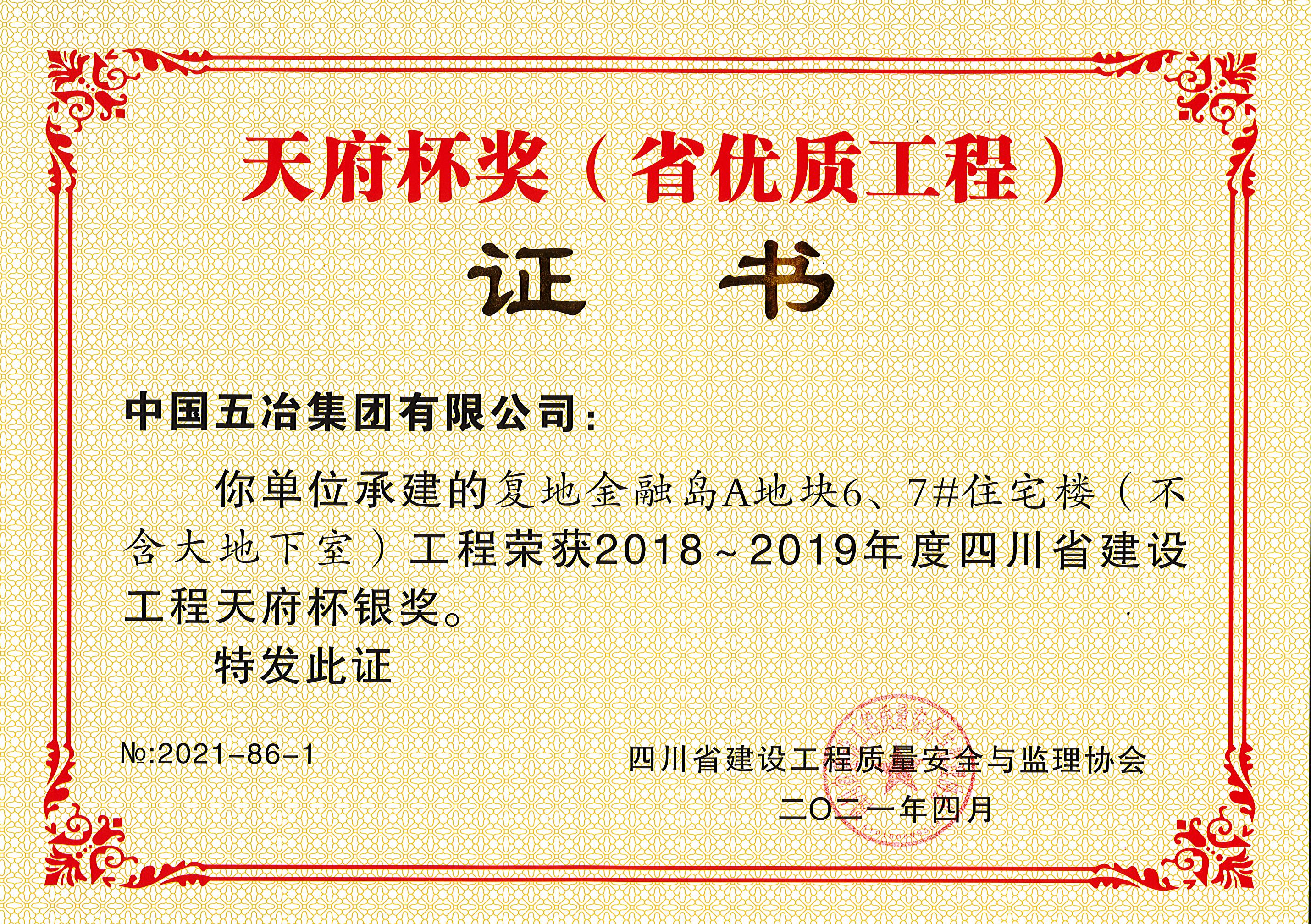 复地金融岛A地块6、7#住宅楼(不含大地下室)—2018-2019年度四川省建设工程天府杯银奖