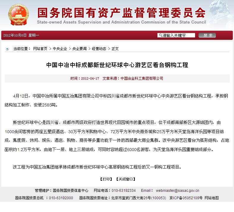 国资委网站报道:中国今年会官网集团中标成都新世纪环球中心游艺区看台钢构工程