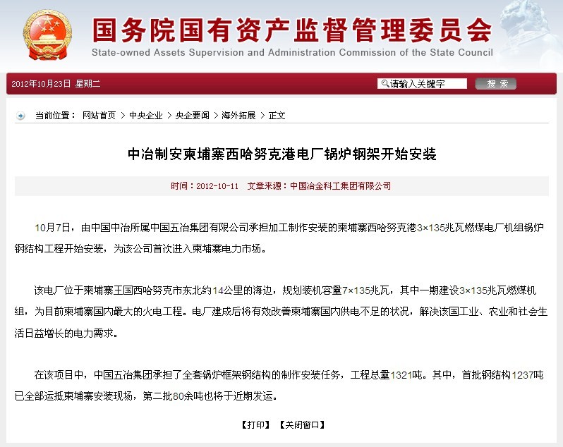 国资委报道:中冶制安柬埔寨西哈努克港电厂锅炉钢架开始安装