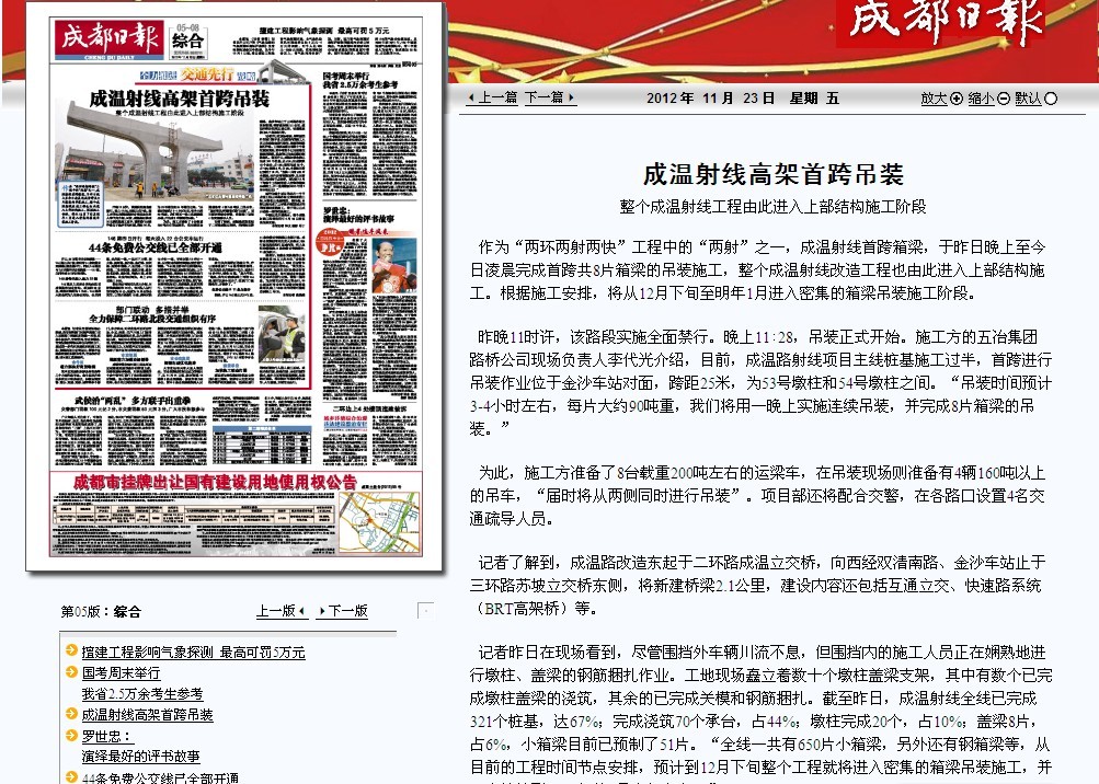成都日报报道:成温射线高架首跨吊装