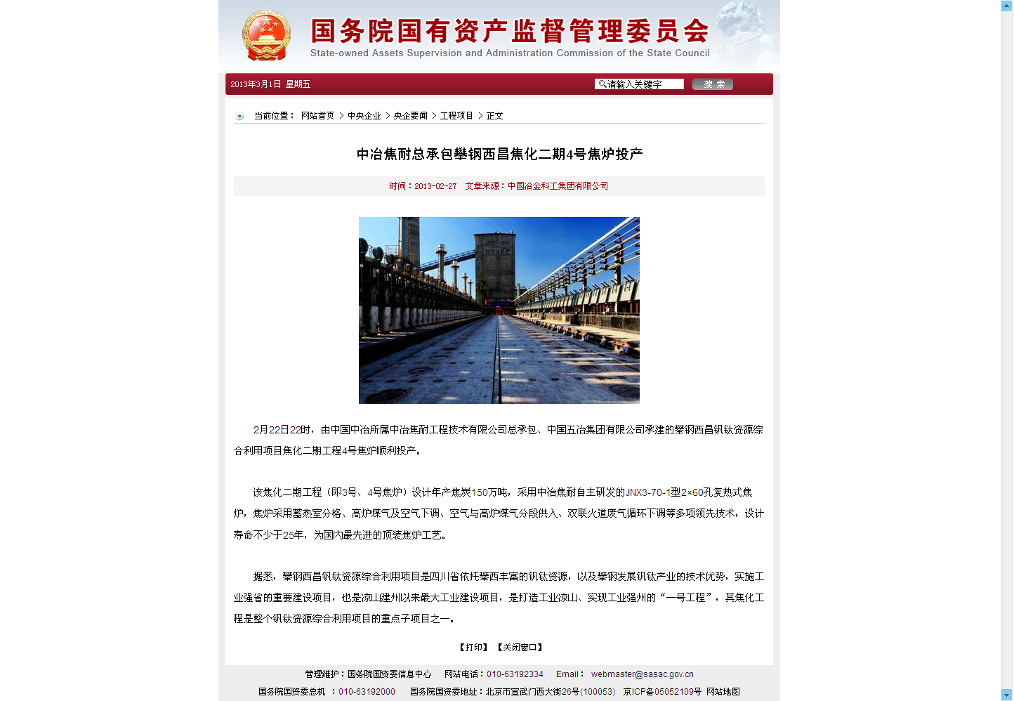 国资委报道:中冶焦耐总承包攀钢西昌焦化二期4号焦炉投产