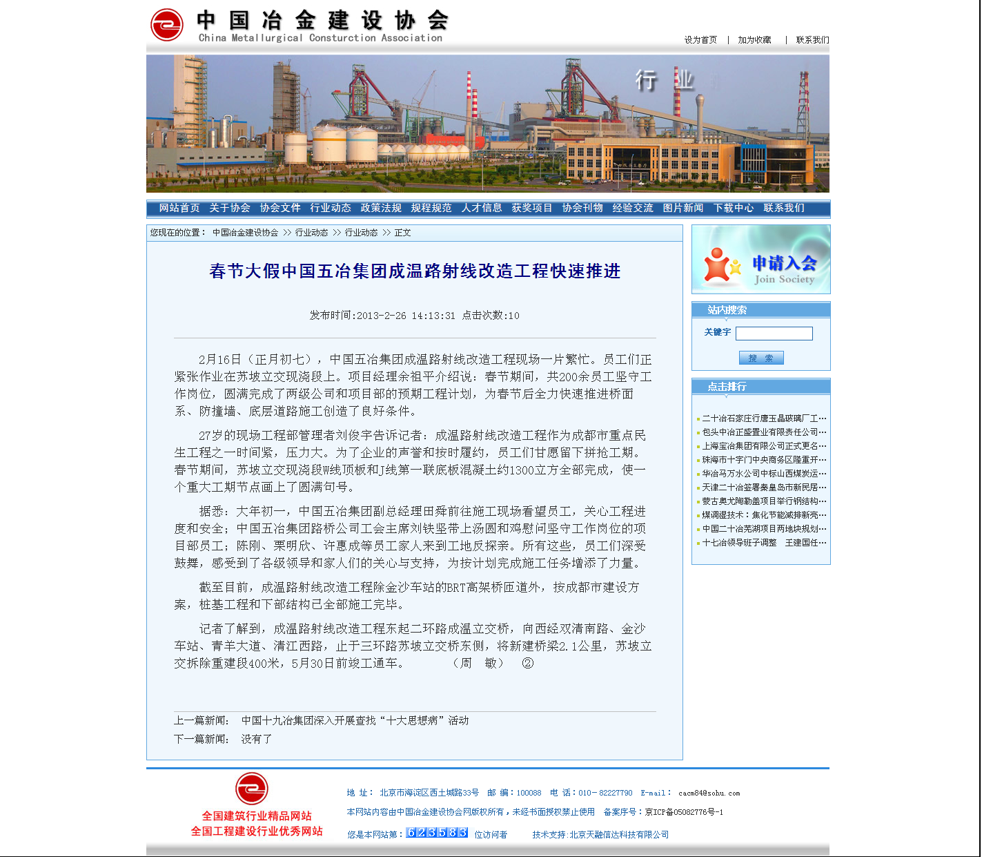 中国冶金建设协会报道:春节大假中国今年会官网集团成温路射线改造工程快速推进