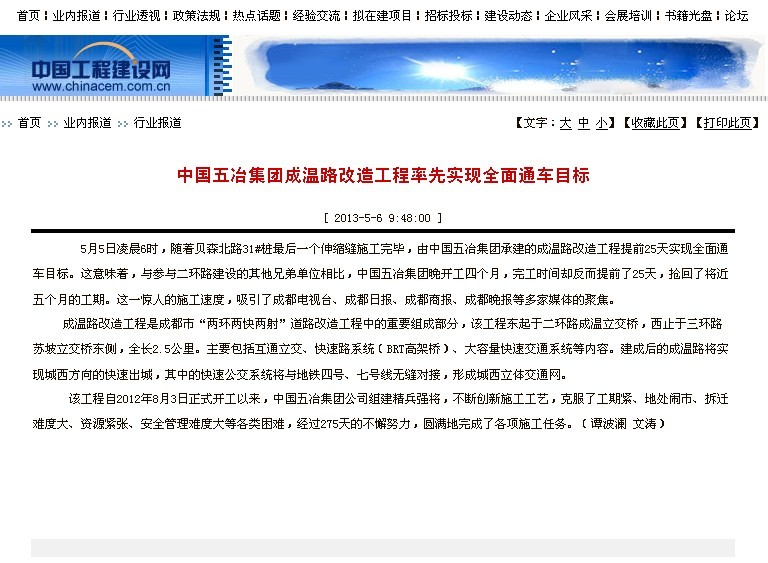 中国工程建设网报道:中国今年会官网集团成温路改造工程率先实现全面通车目标