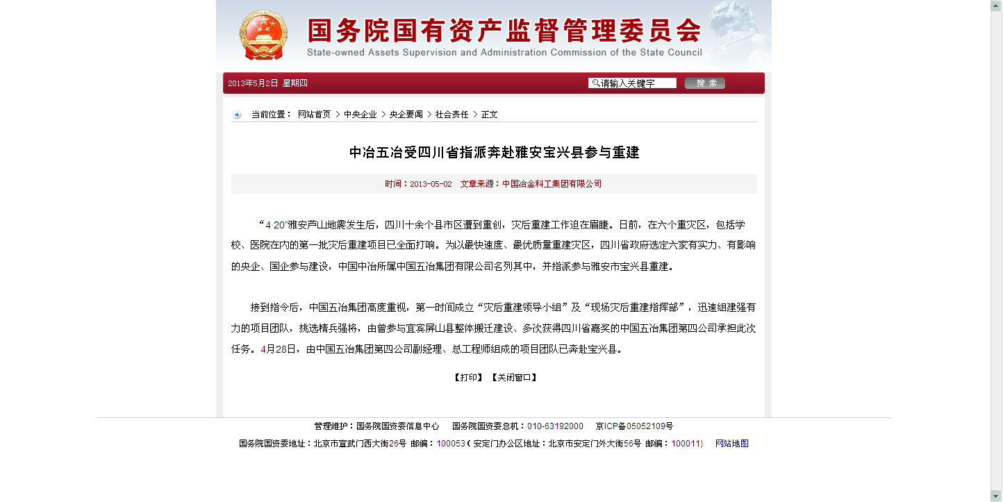 国资委报道:中冶今年会官网受四川省指派奔赴雅安宝兴县参与重建