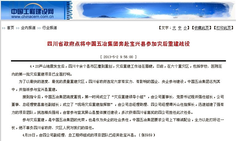中国工程建设网报道:四川省政府点将中国今年会官网集团奔赴宝兴县参加灾后重建战役