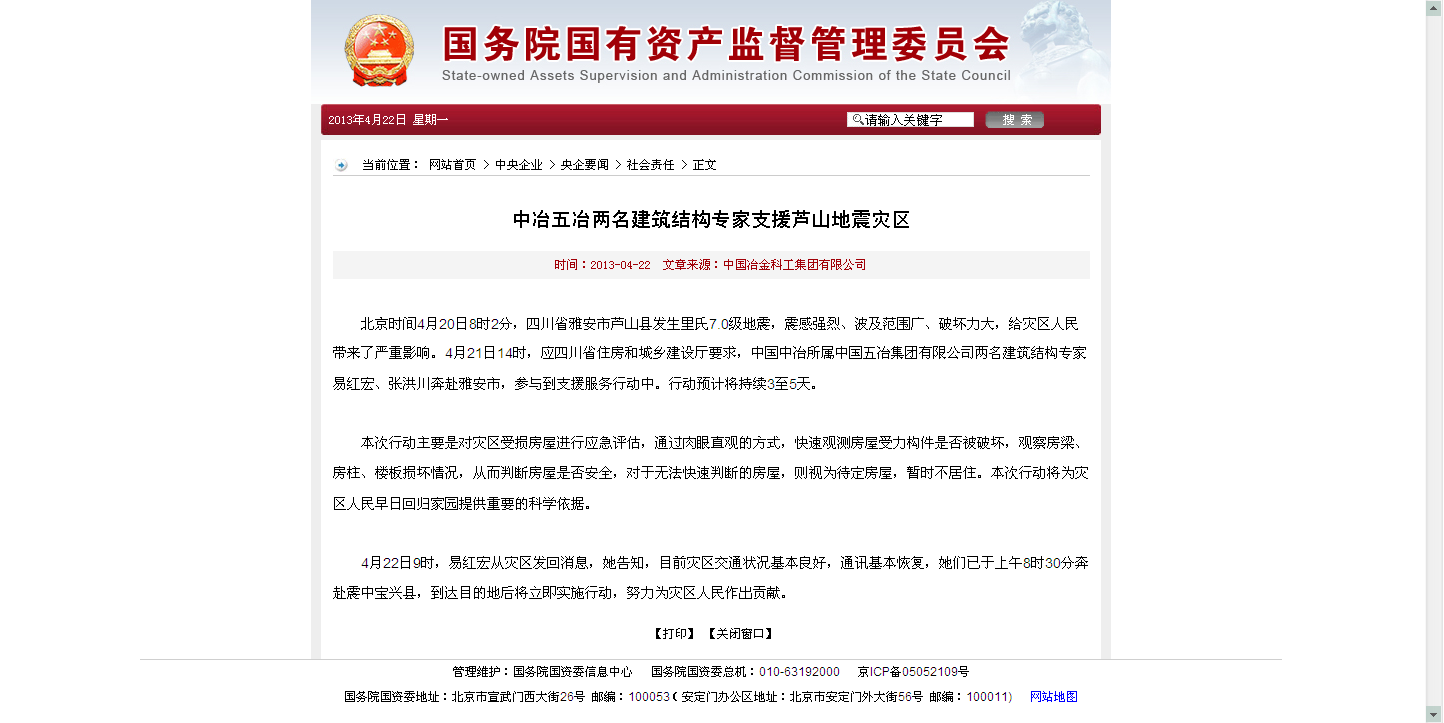 国资委报道:中冶今年会官网两名建筑结构专家支援芦山地震灾区