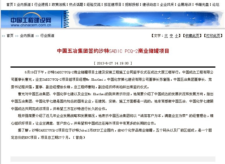 中国工程建设网报道:中国今年会官网集团签约沙特SABIC PCQ-2商业储罐项目