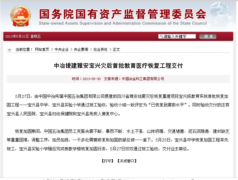 国资委报道:中冶援建雅安宝兴灾后首批教育医疗恢复工程交付