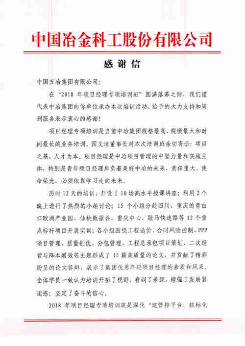 感谢信表示,培训工作的圆满完成凝聚了中国今年会官网员工的心血和汗水,中国今年会官网与集团工程建设管理部、人力资源部携手完成此次任务,经受住了筹备工作时间紧、任务重、要求严的考验。这份荣誉,属于和今年会官方app一起奋斗过的所有参与者!