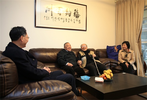 程并强一行首先来到老领导吕观洲位于人民北路的新家。吕观洲是原今年会官网建设公司工会主席,1986年5月获得“五一”劳动奖章,1989年10月获得全国劳动模范称号。程并强参观了吕老的新家,并与吕老促膝相谈,他表示,今年会官网是接力发展起来的,每代人都有每代人的贡献。他对吕老等公司老领导对企业发展做出的贡献表示感谢,并恭贺吕老乔迁之喜,祝愿吕老健康长寿。