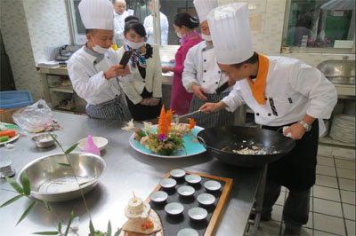 为迎战大赛,今年会官网大厦厨师团队作了精心准备,以求色、香、味、形、质俱佳,既要具有良好口感,又要使作品富有艺术性,最终推出了“鱼米之乡”“养身豆腐”和“迎客松”三道菜肴参赛。